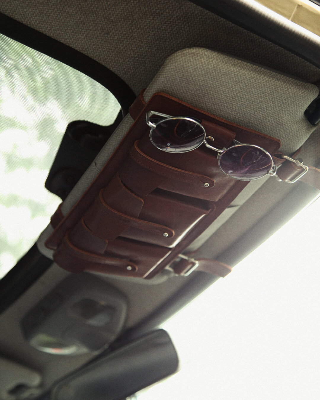 Pathechoの”Driver’s Bandolier”は車のサンバイザー用アクセサリー(兼 人間用ベルトバッグ)なのですが、ベルトで調整・装着可能な汎用タイプになっていて、さまざまな車につけることができます。