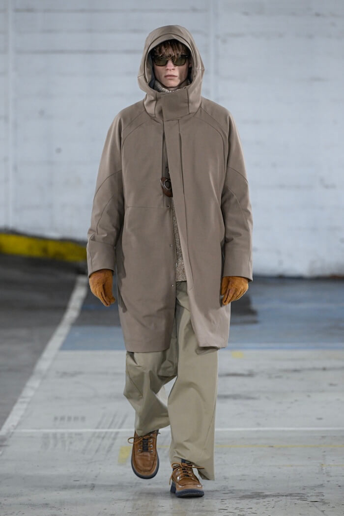 口笛が会場に響くなか、姿を見せたのはキャラクターの異なるひとたち。ホワイトカラー風からブルーカラー風まで、ひとりひとり物憂げな表情で円形のランウェーを歩く、ノマドな雰囲気です。
