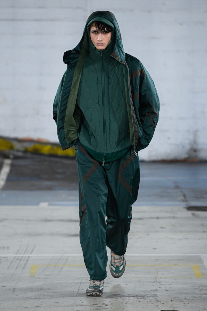 このブランドに欠かせないシャツやニットは、グラフィックをあしらったものが目を引きました。そのグラフィックというのはアーティストの髙田唯と小林一毅、二人の作品です。これがキャンバスのようなプレーンなアイテムに個性を与え、その存在を際立たせていたように感じます。そして、〈フレッドペリー〉のポロシャツや〈アシックス〉のスニーカーといったコラボアイテムもアクセントに。