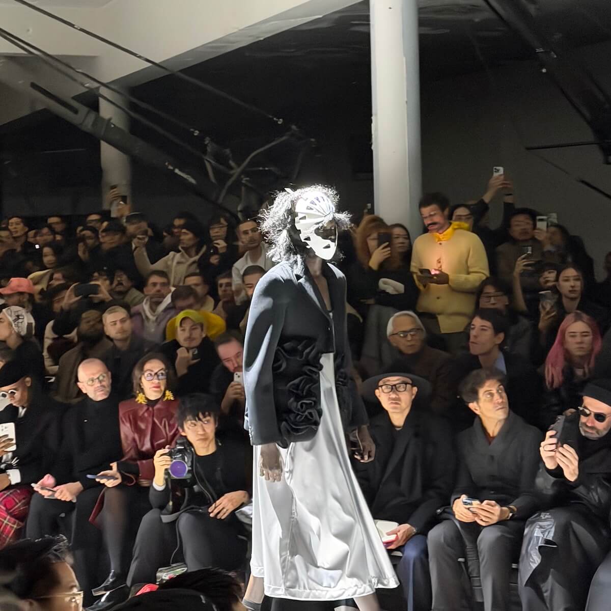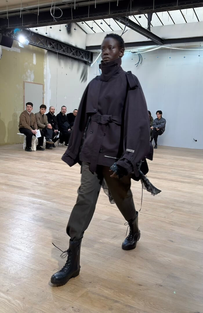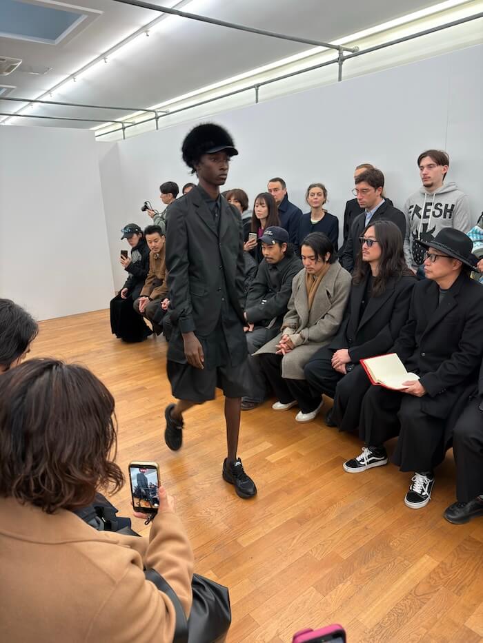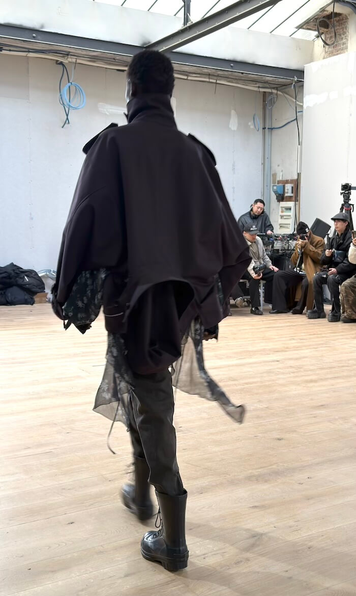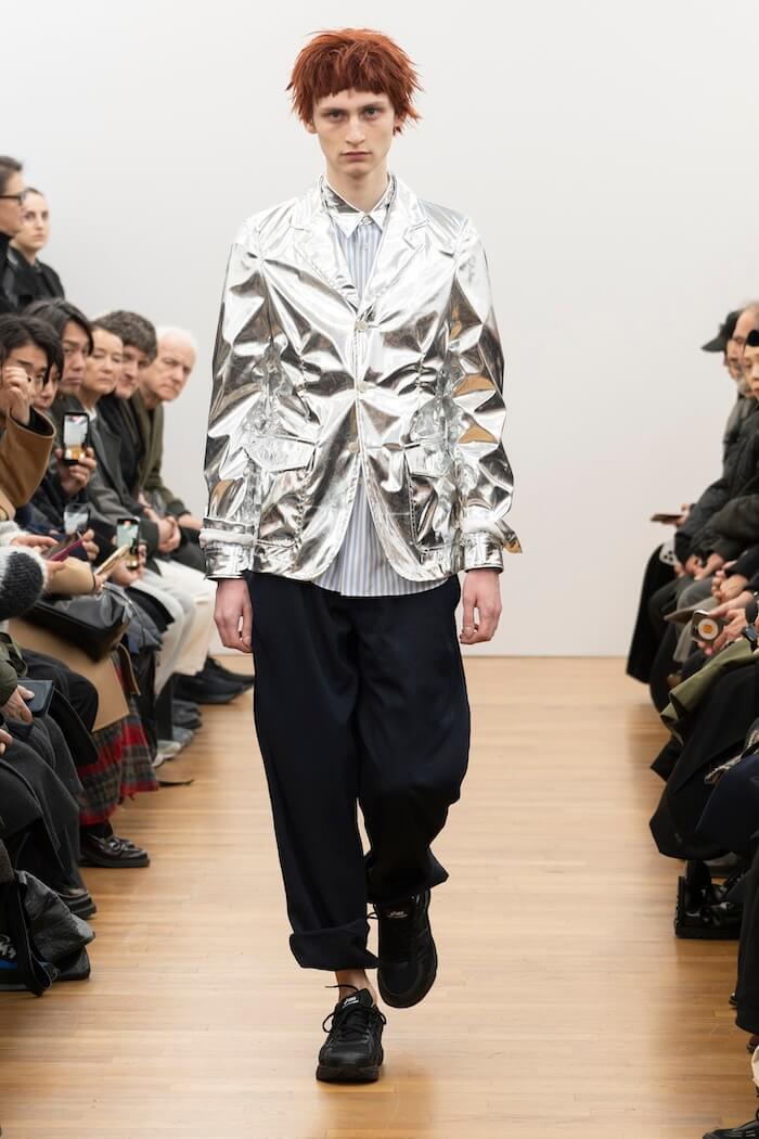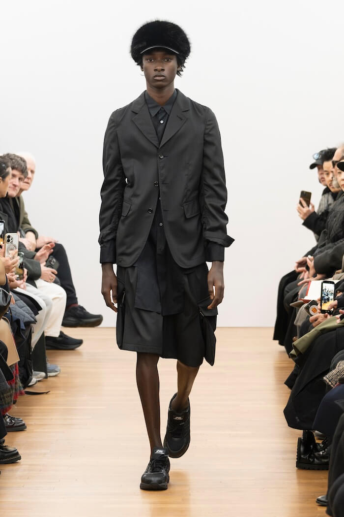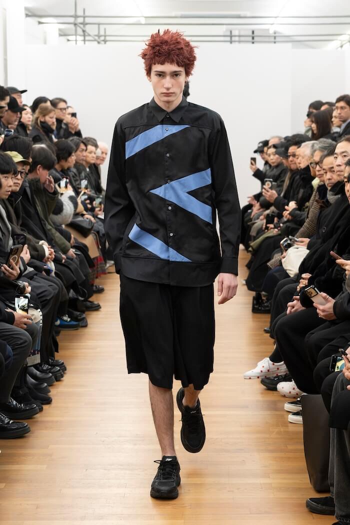 驚いたのは、キーとなるファーストルックが全身黒だったこと。「コム デ ギャルソン」社のブランドにとって黒は特別な意味を持つ色ですが、先にコレクションを披露した〈コム デ ギャルソン・オム プリュス〉〈ジュンヤ ワタナベ マン〉を含む3つのブランドが今回揃って黒を全面に打ち出しました。