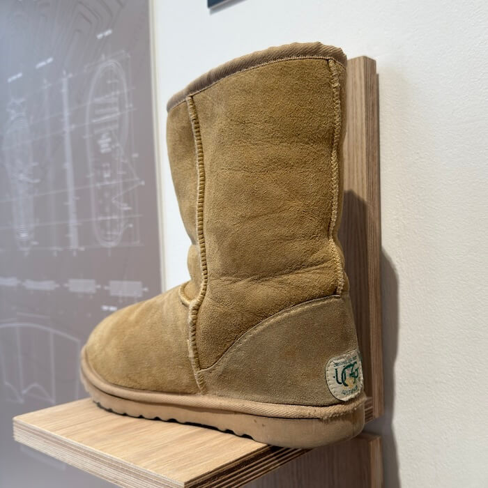 会場ではイニシャルをその場で入れられるレザータグのワークショップに加えて、創業当時の貴重なブーツも展示。改めて〈アグ〉の魅力を知ることのできる機会になりました。