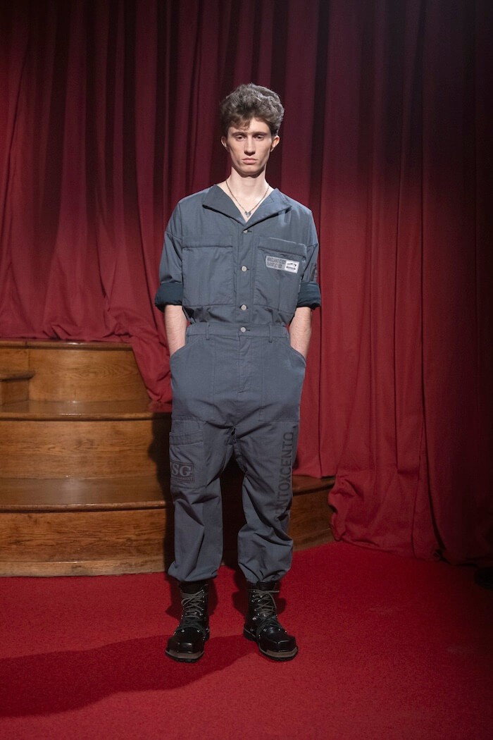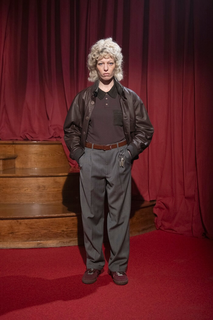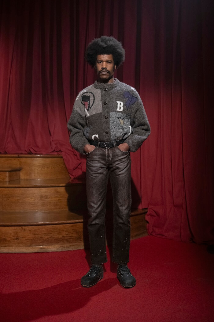 これに合わせて服もどこかいなたい雰囲気で、肩が張ったテーラードジャケットや腰回りがゆったりしたチョークストライプのスラックス、つなぎ、やれたレザージャケット、素朴なセーターなど、どれもいい表情をしています。