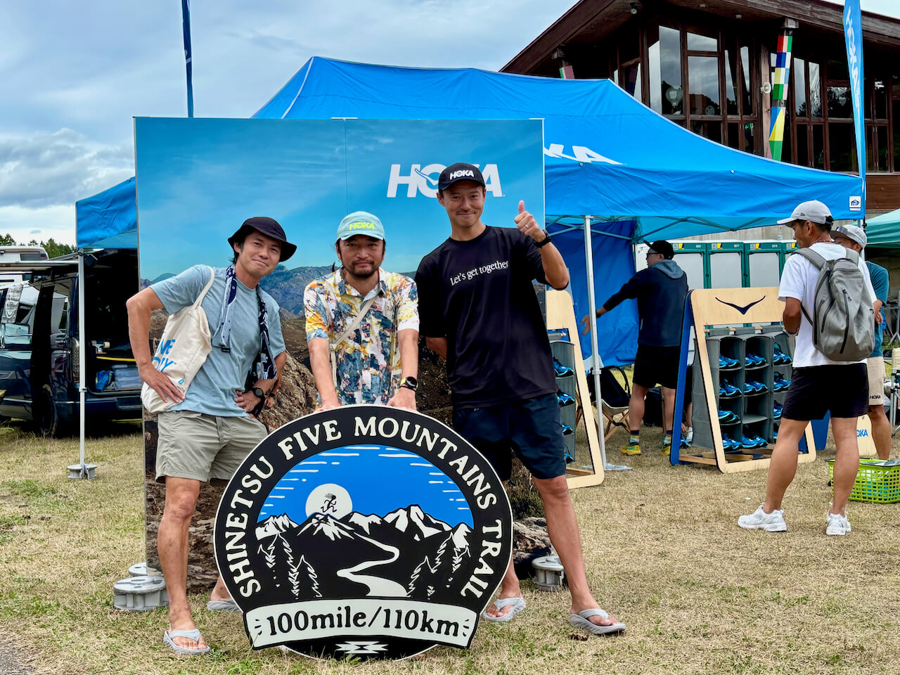 レース前日、大会会場のHOKAブース前にて。このときはまさか翌日大雨に見舞われるなど想像もしていませんでした。