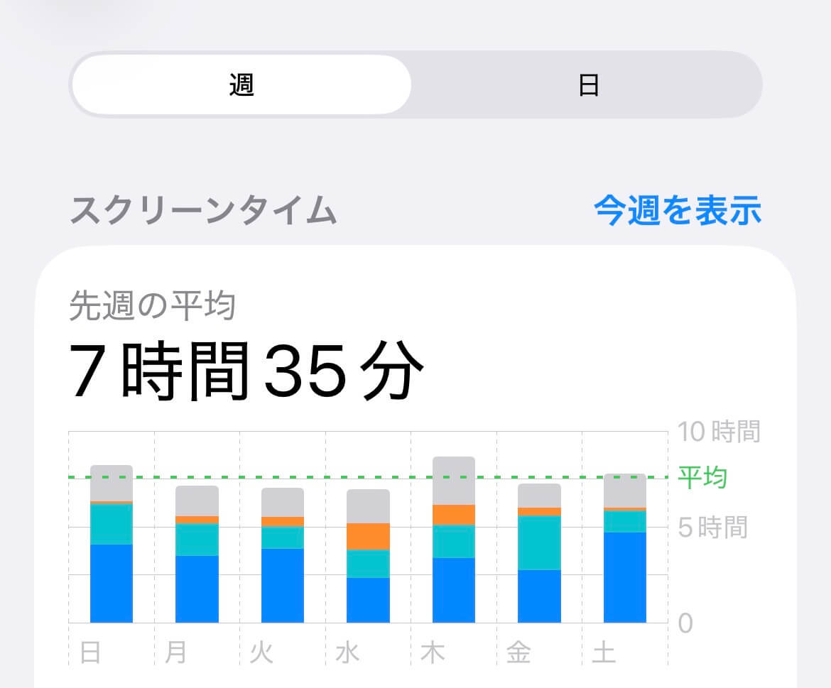 iPhoneの場合は「設定」→「スクリーンタイム」でその数値を見ることができるのだけど、自分の先週の平均はというと、、