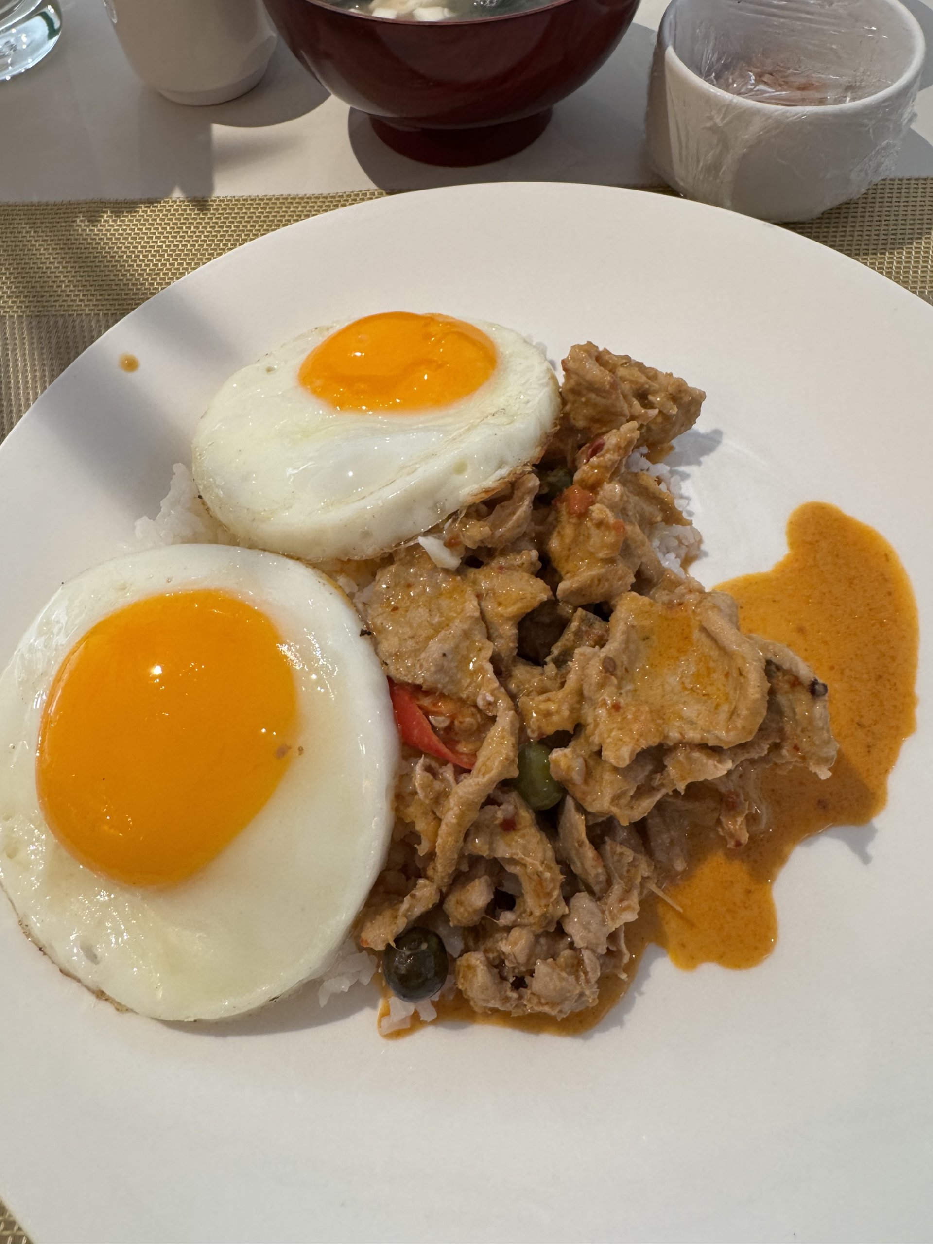 本日も目玉焼き2個とかなり少量のタイ米とその日のオススメおかずを乗せていただきます。