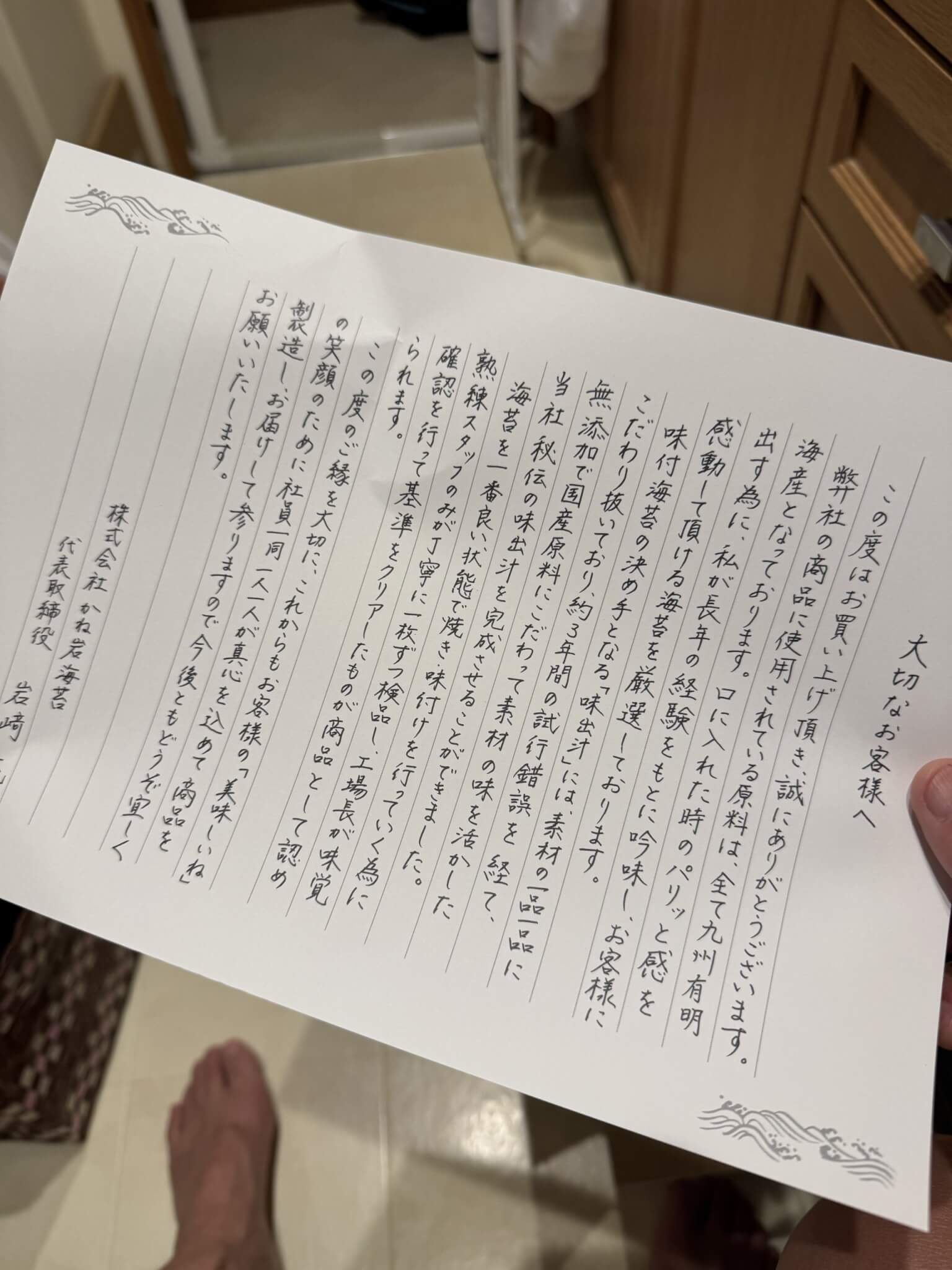以前、いつものバーで酔っ払って注文した、高級海苔が届いているじゃないですか笑。