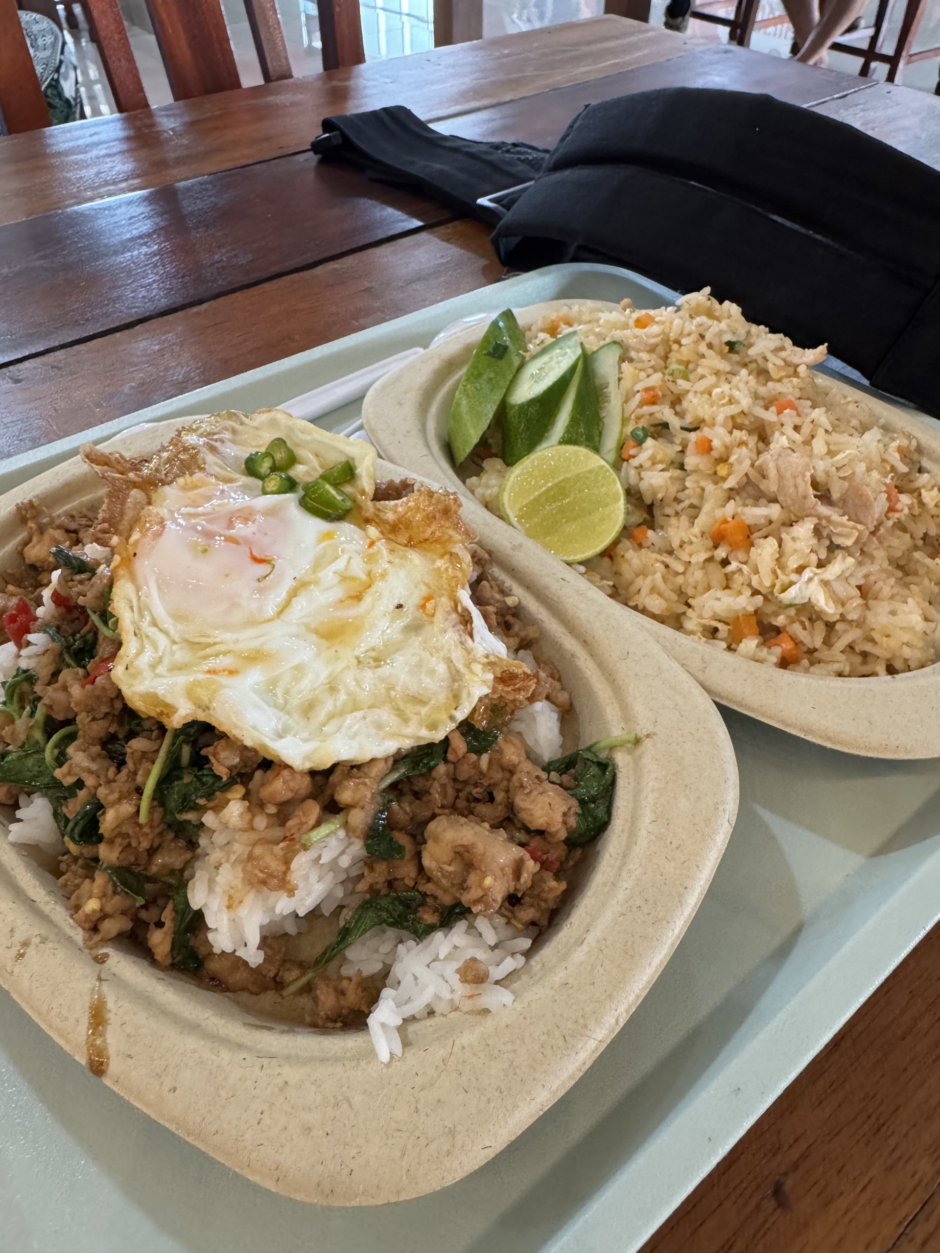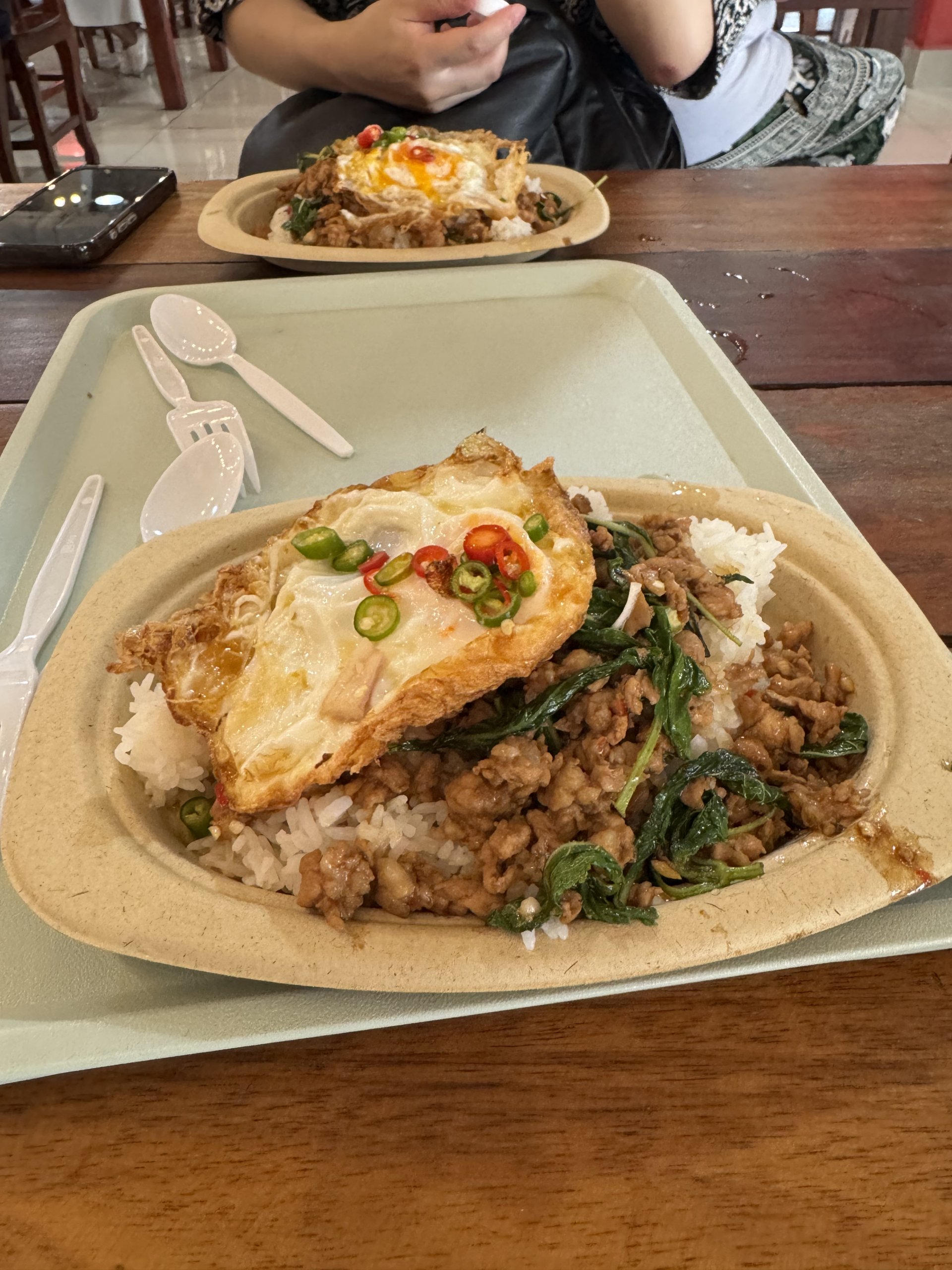 上の階にあるフードホールで300円くらいで食べれるガパオライスや