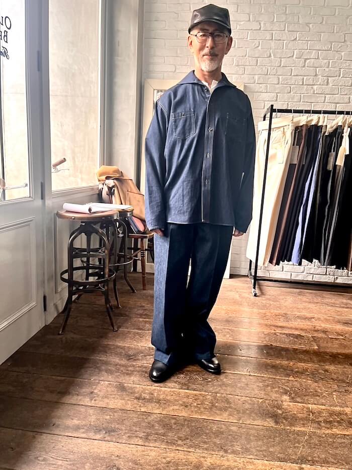 このデニムのシャツは見た目よりもかなりライトオンスなので、とても軽くて涼しいです。デニムのパンツは非常に美しいシルエットで、昔の美しいバギーパンツのよう。デニムをエレガントなセットアップとして着るにはとても良い組み合わせです!