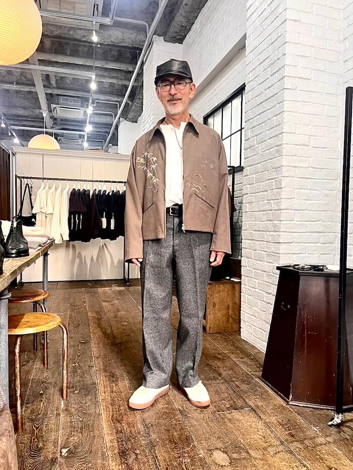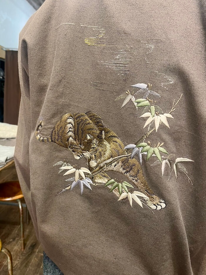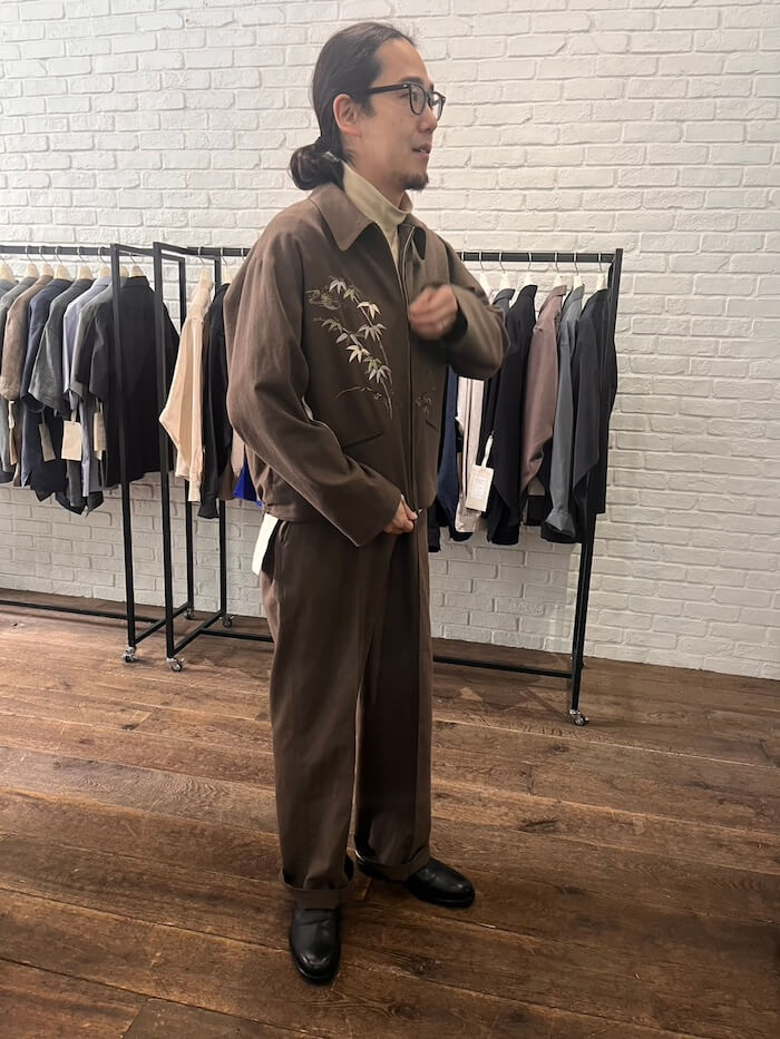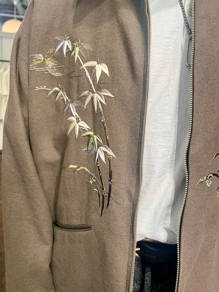 まずはここ何シーズンか続いている刺繍のシリーズ。ジュートと呼ばれる麻素材ですが、環境負荷が少ないオーガニックな素材で通気性と保温性にも優れているそうです。「OLD JOE」の刺繍ものは一般的なものとはクオリティーのレベルが全く異なる次元にあり、着物や帯にあるような細かく美しい仕事がなされています。今回もこのような素晴らしさです!