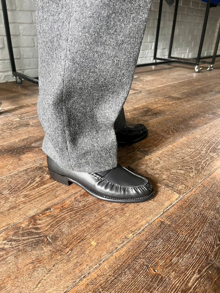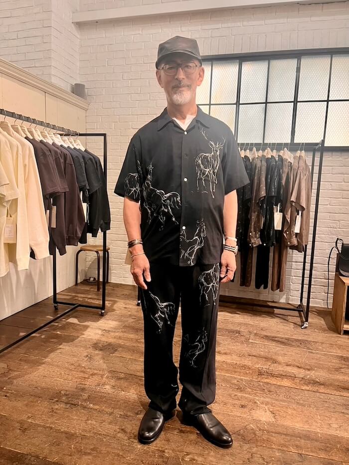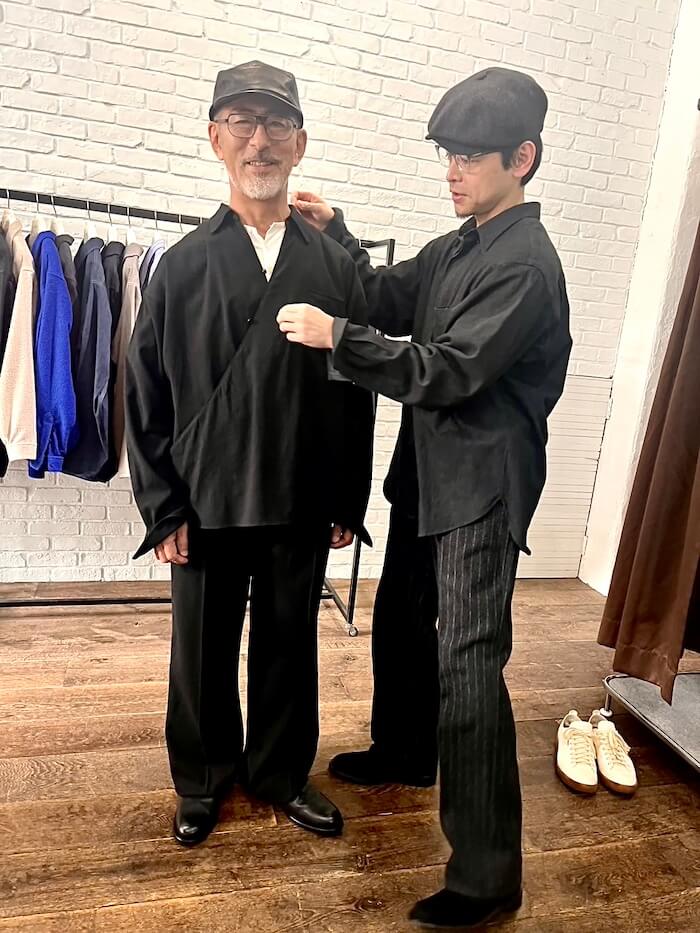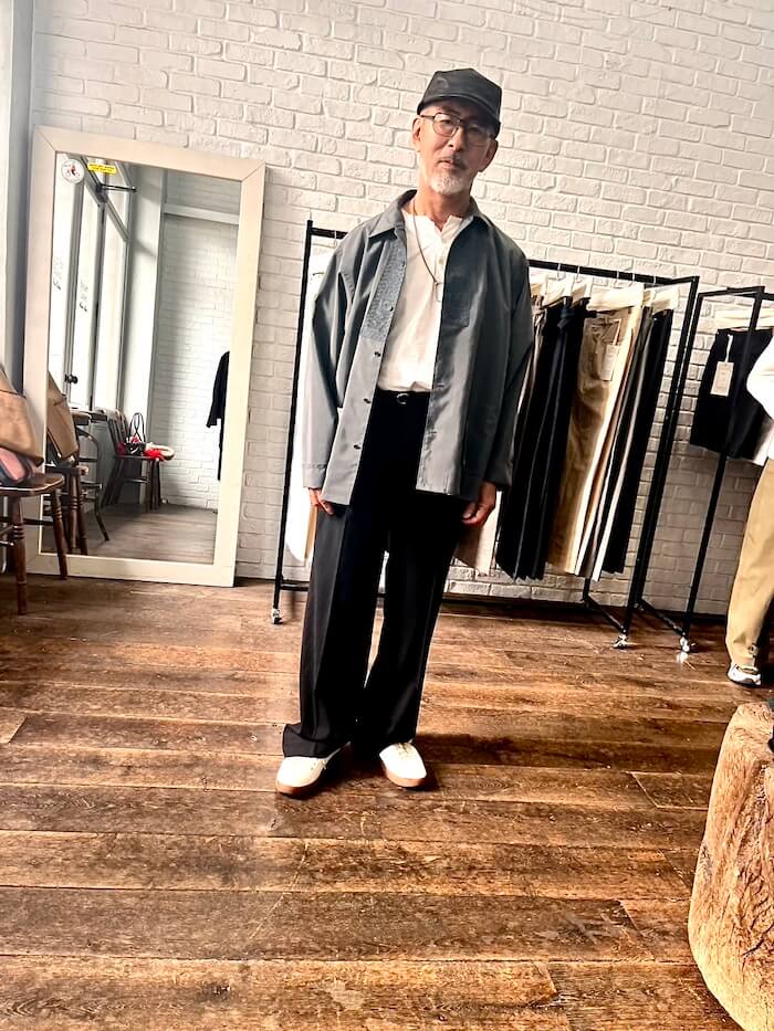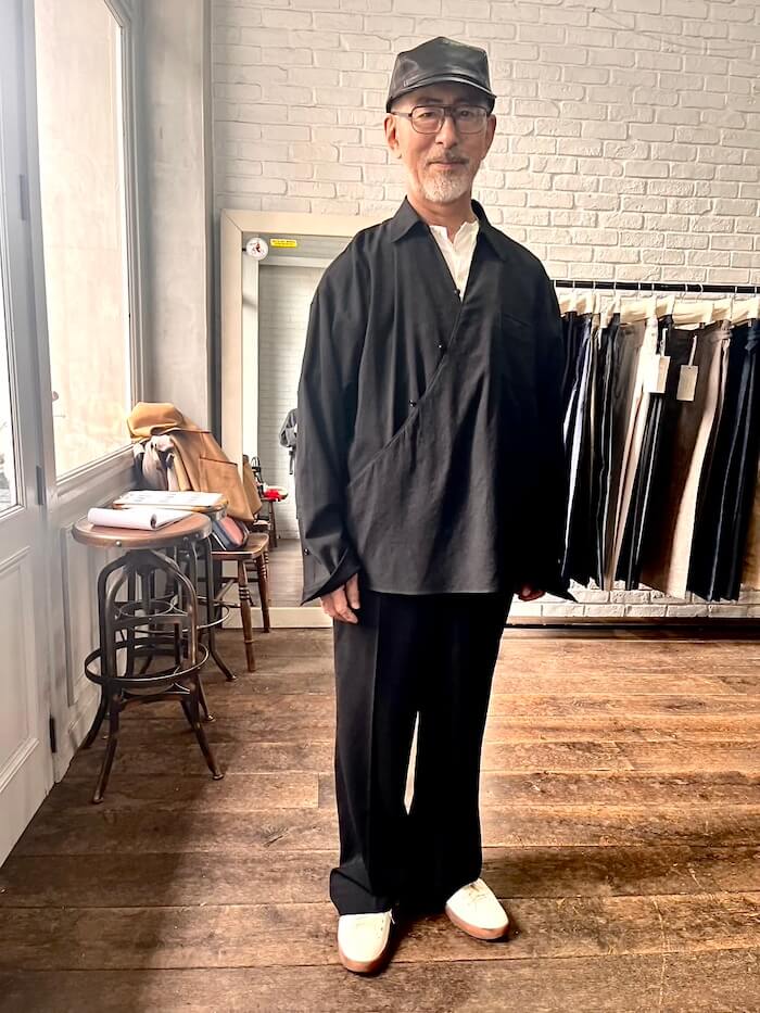次は左右非対称のデザインのチュニックシャツ。秋冬物にもありました。でも今回は細番手のサマーウール、レーヨンとシルクを混紡しているそうで、非常に軽く、涼しげな素材です。同素材のパンツと合わせて着てみると、柔らかい素材が生み出すドレープ感と、ゆったり目のサイズで着た際のリラックス感と上品さが素晴らしいセットアップでした!これは欲しい!