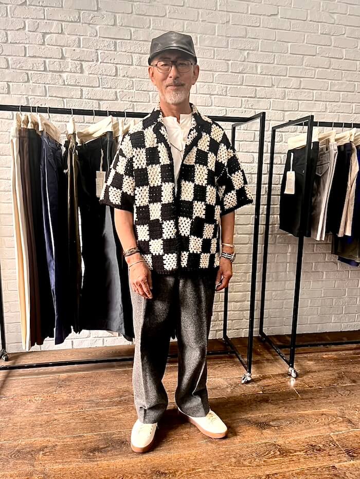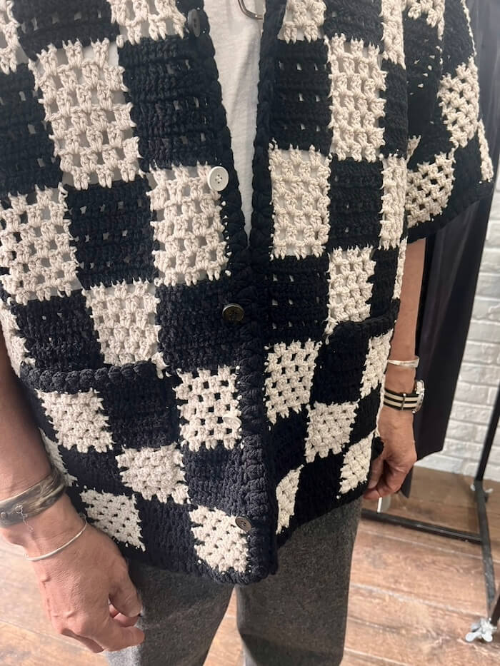 手編みのかぎ針編み柄をサマーシャツに仕上げた、洒落た一枚。中が空洞になっている糸を使用しているそうで、ボリュームが作る美しいシルエットと、涼しく穴開きのある編み地がそれ自体柄を表現する魅力的な質感を出しています。