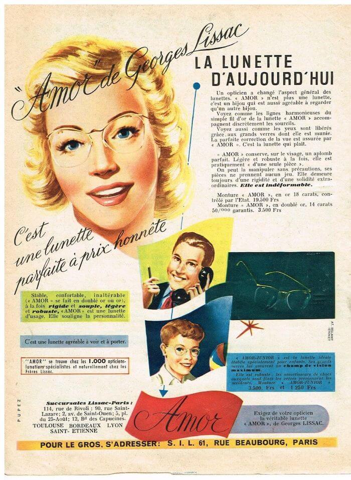 第二次世界大戦中ヨーロッパに渡ってきたアメリカ兵たちが「Numont(ニューモント)」や「Rimway(リムウェイ)」という、レンズ上部に端から端まで一文字に配されたメタルバーに対してレンズが固定された眼鏡を掛けており、ヨーロッパの人たちに「semi-rimless(半縁無しメガネ)」のコンセプトが伝わりました。1946年George Lissac氏によって「SIL(Société Industielle de Lunterie)」社が設立され、この新しいメガネの構造を生かしたフランス版の「semi-rimless(半縁無しメガネ)」が金張りのメガネとして発表されます。1947年に発表した「AMOR」のコレクションは爆発的な人気となりました。