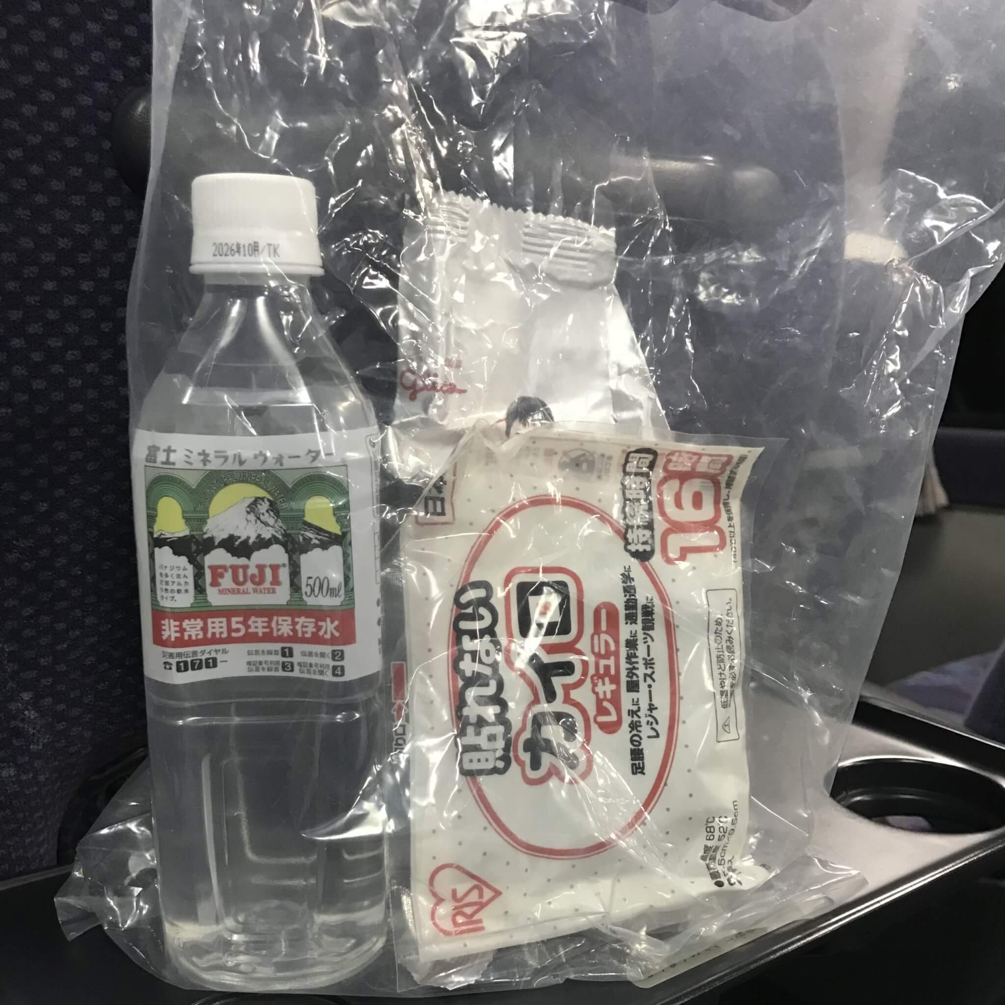 配布された水とカイロとビスコ。カイロは使わなかったので、冬の間長距離移動するときは持参しようと思う。